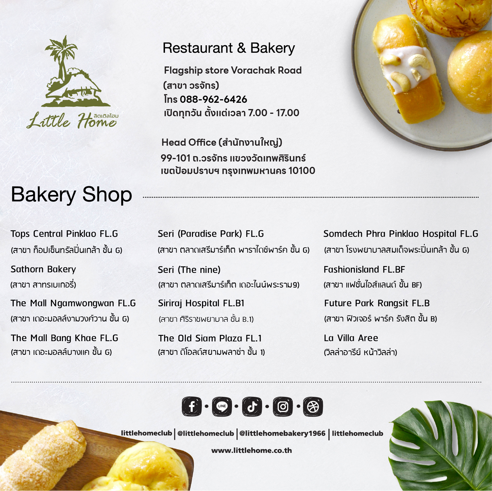 ลิตเติลโฮมเบเกอรี่ (Little Home Bakery) ร้านขนมที่จะมอบความสุขด้วยความอร่อยจากเบเกอรี่นานาชนิด ร้านลิตเติลโฮมเบเกอรี่ มีสาขาทั้งสิ้น 13 สาขา ในกรุงเทพฯ ปริมณฑล รวมถึงห้างสรรพสินค้าชั้นนำ ไว้คอยบริการลูกค้าให้ได้รับความสะดวก กับสาขาใกล้บ้าน ทั้งหน้าร้านและสั่งผ่าน Delivery